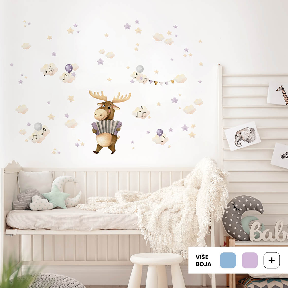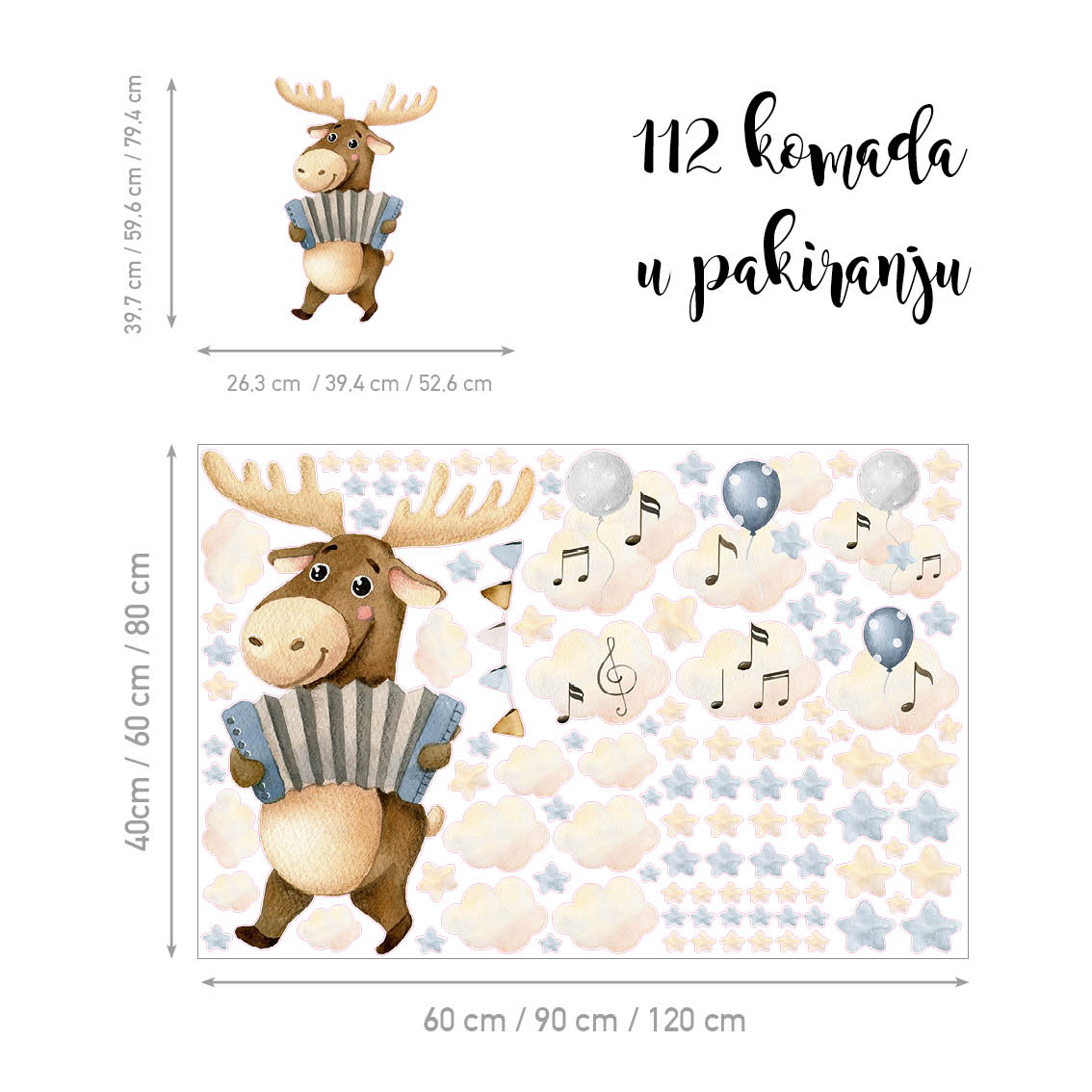 Upoznajte veselog losa koji svira harmoniku i unosi dozu šumskog veselja u svaku dječju sobu! Ove tekstilne naljepnice za zid los inspirirane su glazbom, nježnim bojama i toplinom prirode. Akvarelni motivi oblaka, nota i balona stvaraju bajkovitu atmosferu koja umiruje i potiče maštu mališana.