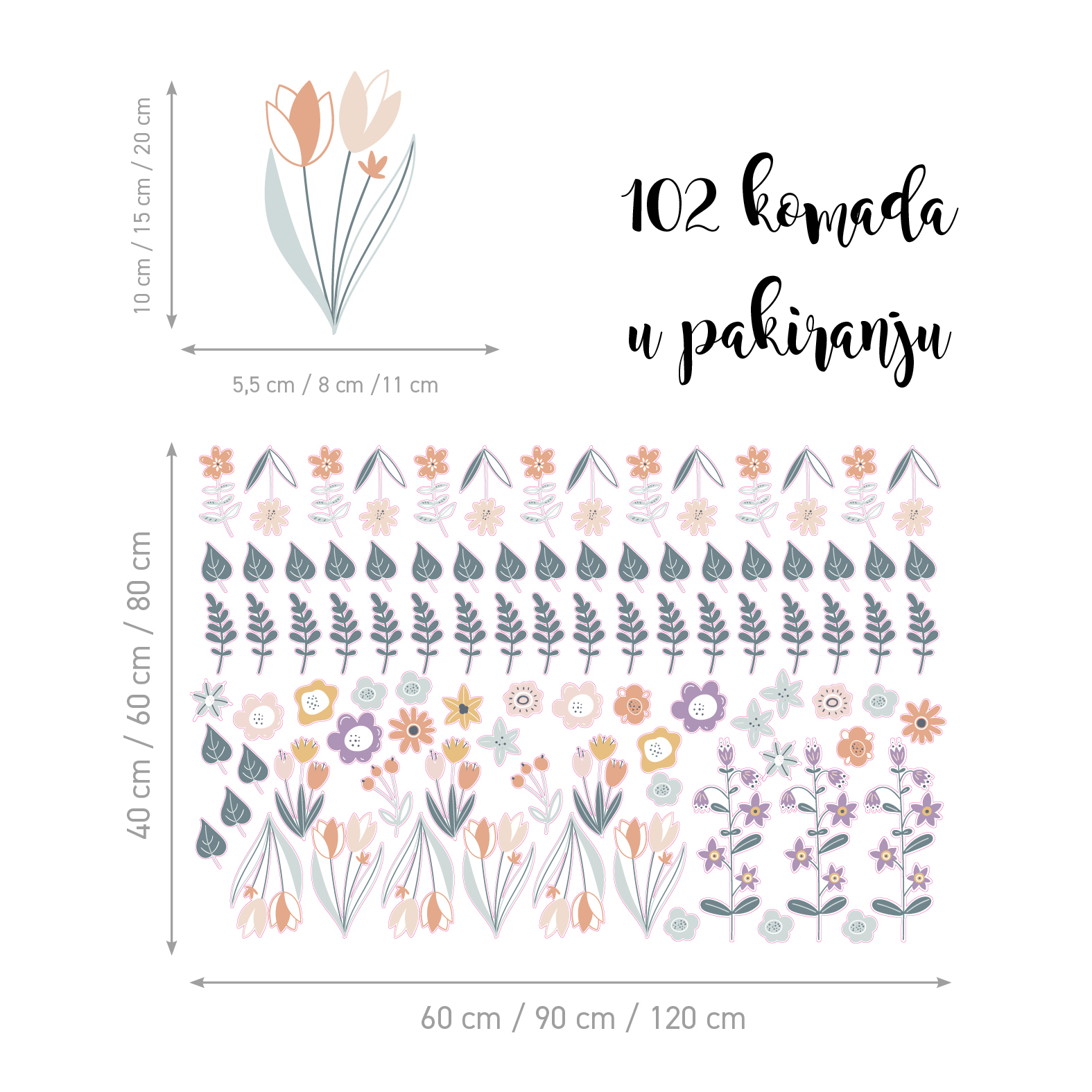 Set sadrži 102 elementa različitih veličina – od sitnih cvjetića do većih stabljika. Kombinacija tonova praškasto roze, nježne ljubičaste, tople oker i pastelno plave čini zid živim, ali i skladnim. Naljepnice su izrađene od kvalitetnog tekstilnog materijala koji je mekan na dodir, bez mirisa i siguran za dječje prostore.