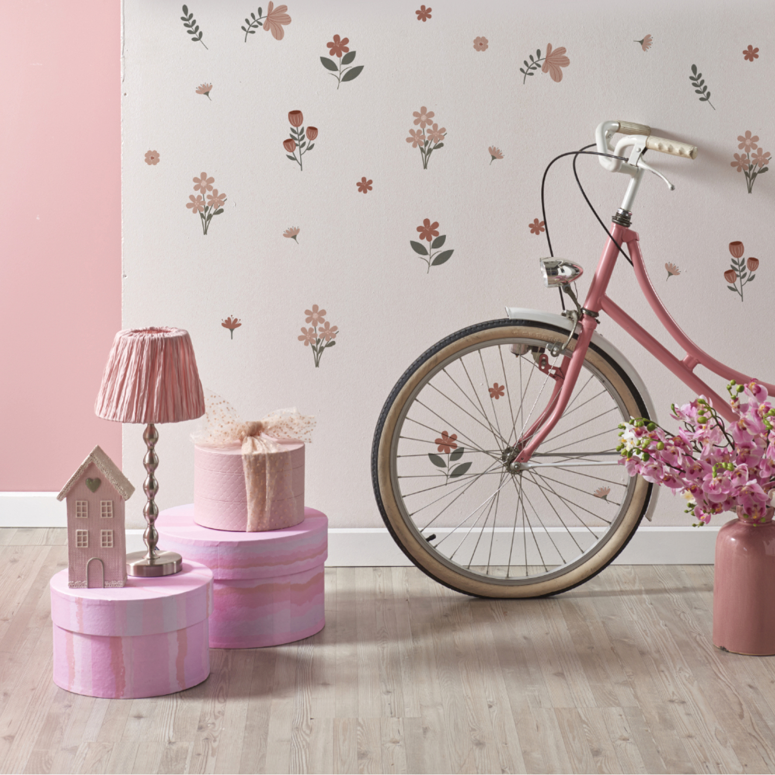 Površina je mat i blago tkanasta, što daje realističan dojam ilustracije na zidu – bez odsjaja, plastike ili neprirodnog sjaja. Kombiniranjem više setova moguće je stvoriti cijelu boho cvjetnu livadu na zidu.